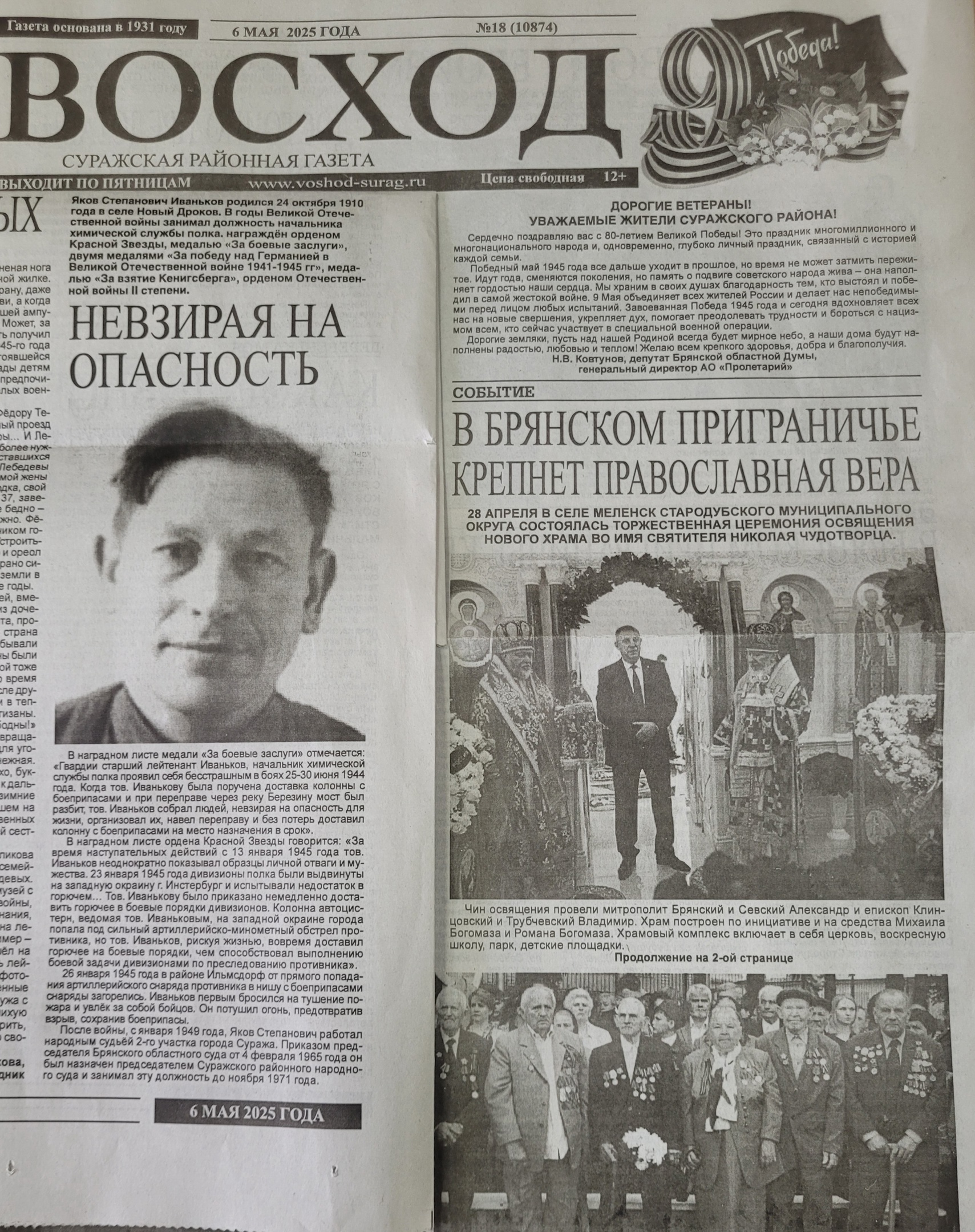 В Суражской районной газете Брянской области «Восход» опубликована статья «НЕВЗИРАЯ НА ОПАСНОСТЬ» (выпуск № 18(10874) от 06 мая 2025 года), посвященная председателю Суражского районного народного суда - ветерану Великой Отечественной войны 1941-1945 гг. Иванькову Якову Степановичу, его подвигах в годы войны, наградах за боевые заслуги, а также профессиональной деятельности в периоды работы в судебной системе. |
